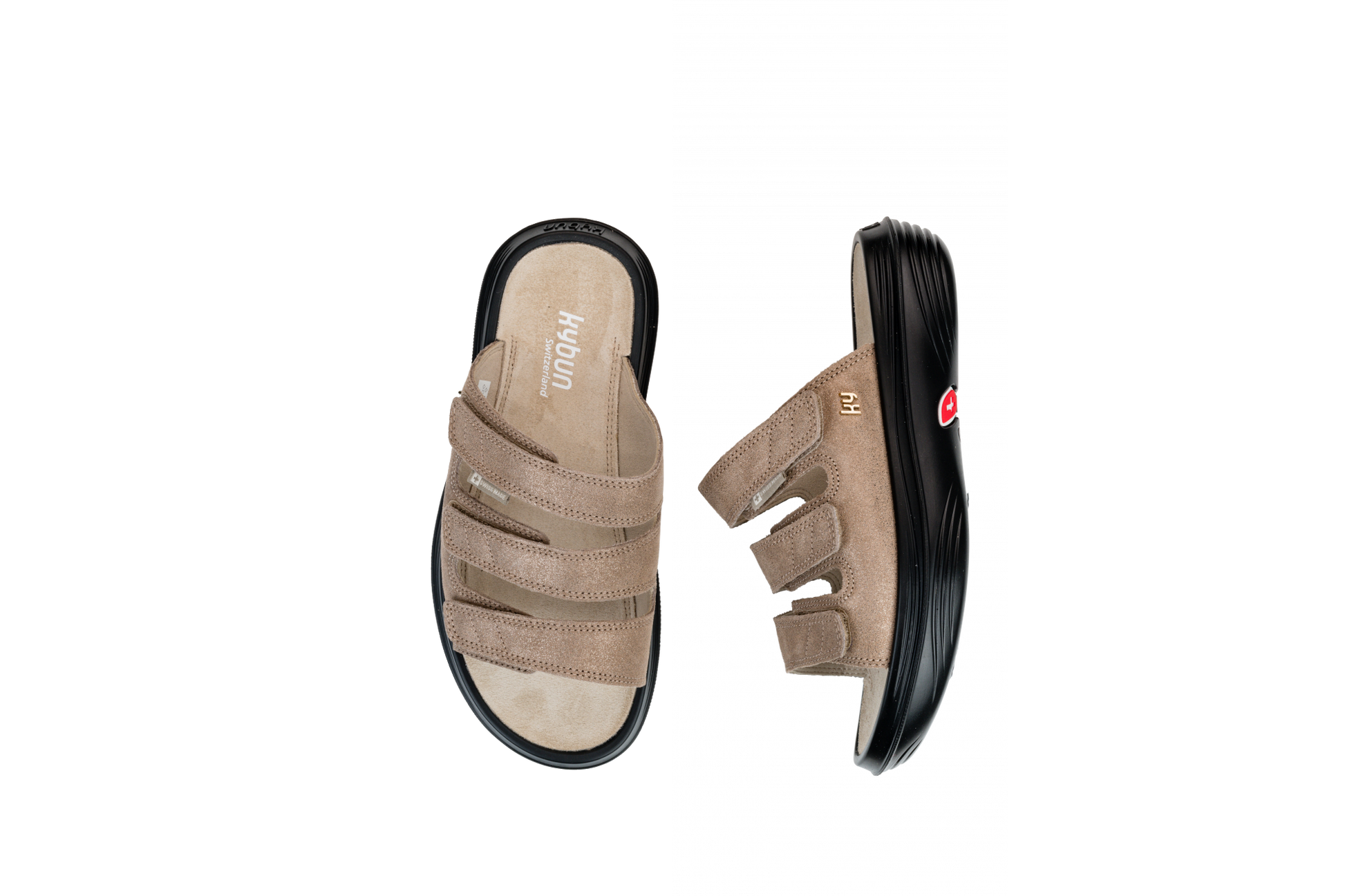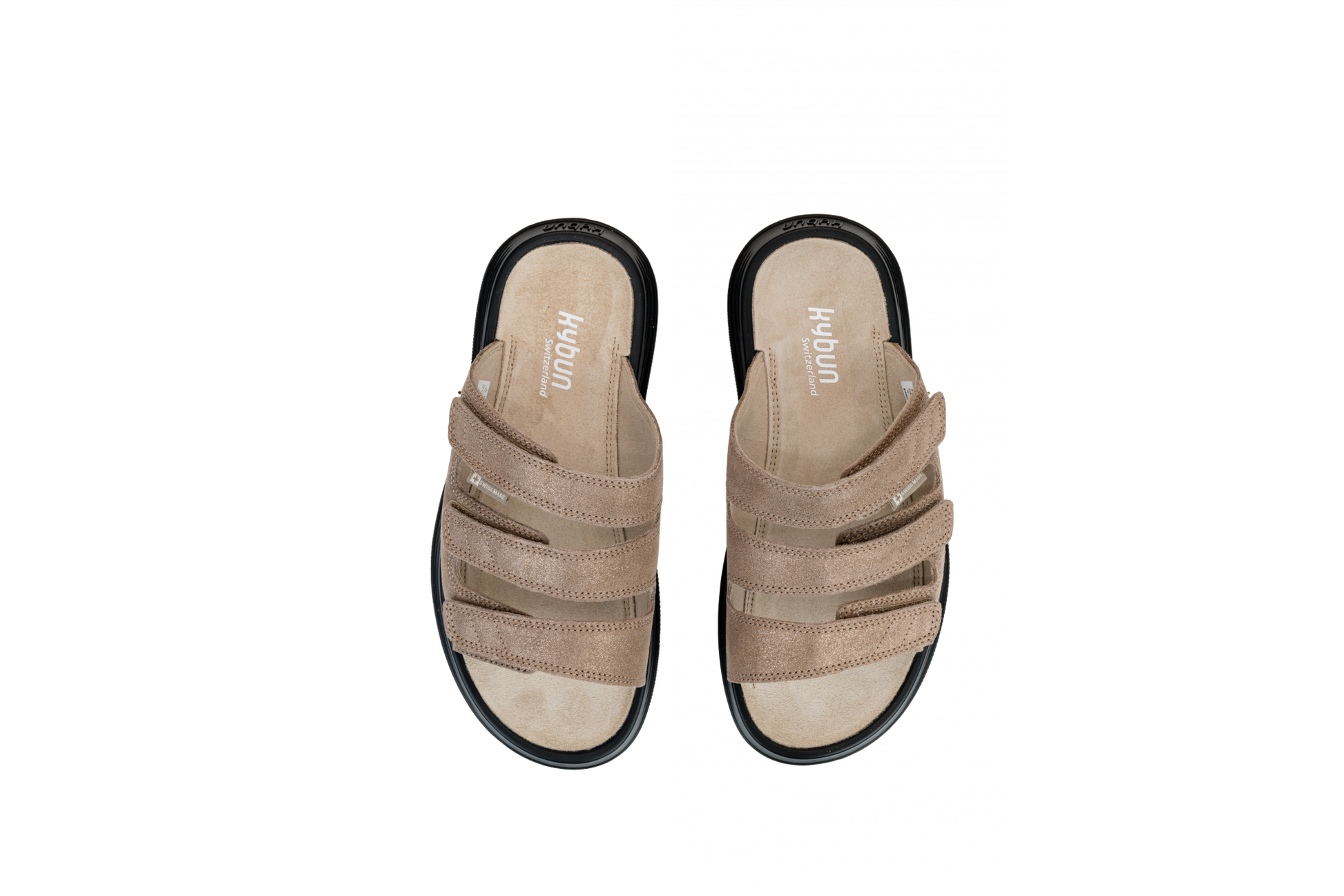 The women's sandal kybun Kriens Sand Sparkle combines urbane style and trend simultaneously. As an all-rounder, the sandal is equally suitable for leisure and home. The upper shoe of the model Kriens Sand Sparkle appears in a subtle brown. With the slight shine of the surface, the model lives up to its name. The airy sandal can be individually adjusted to a woman's foot by means of three velcro fasteners over the instep.