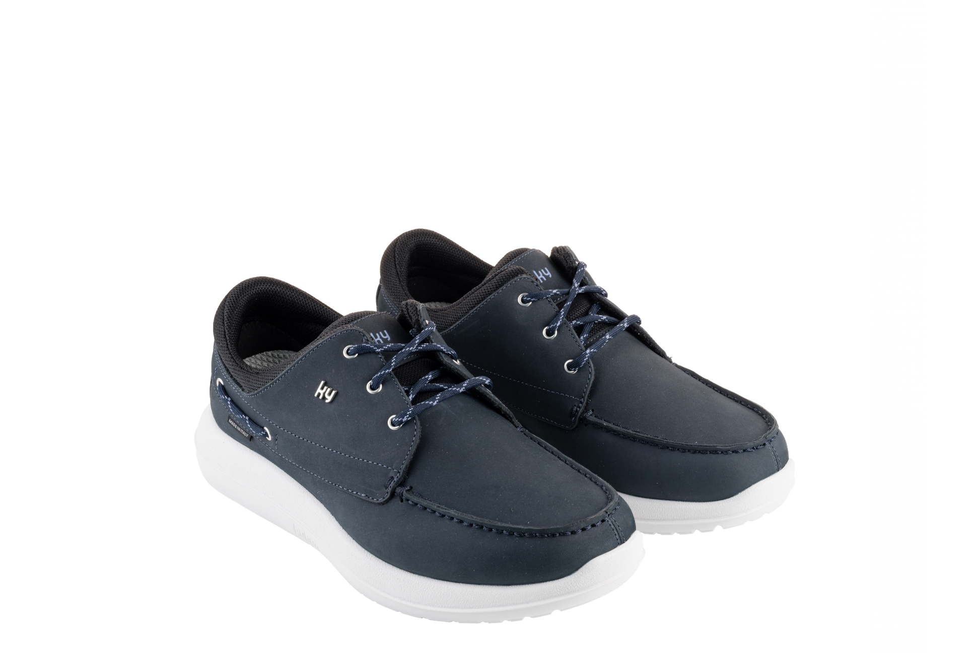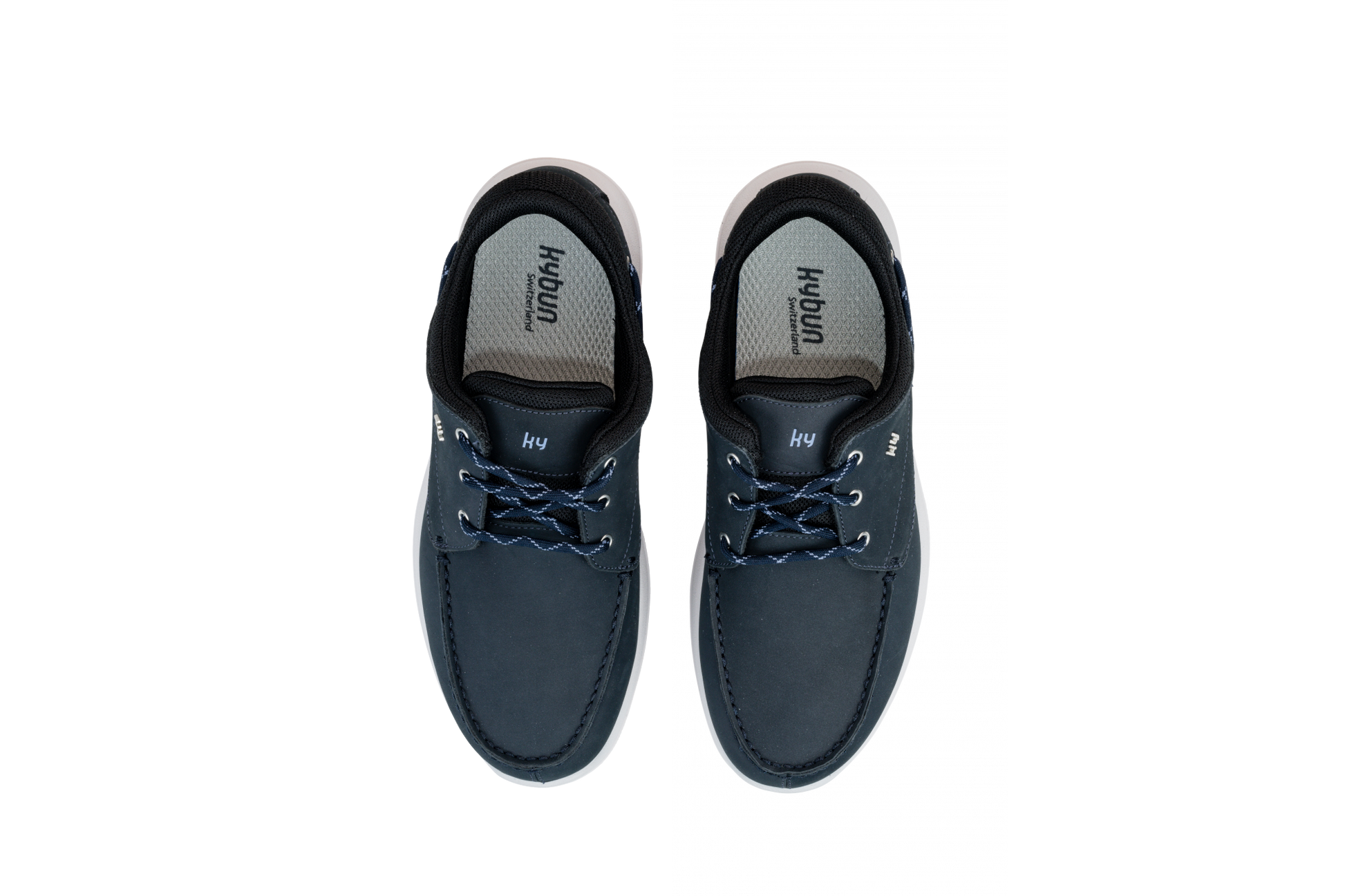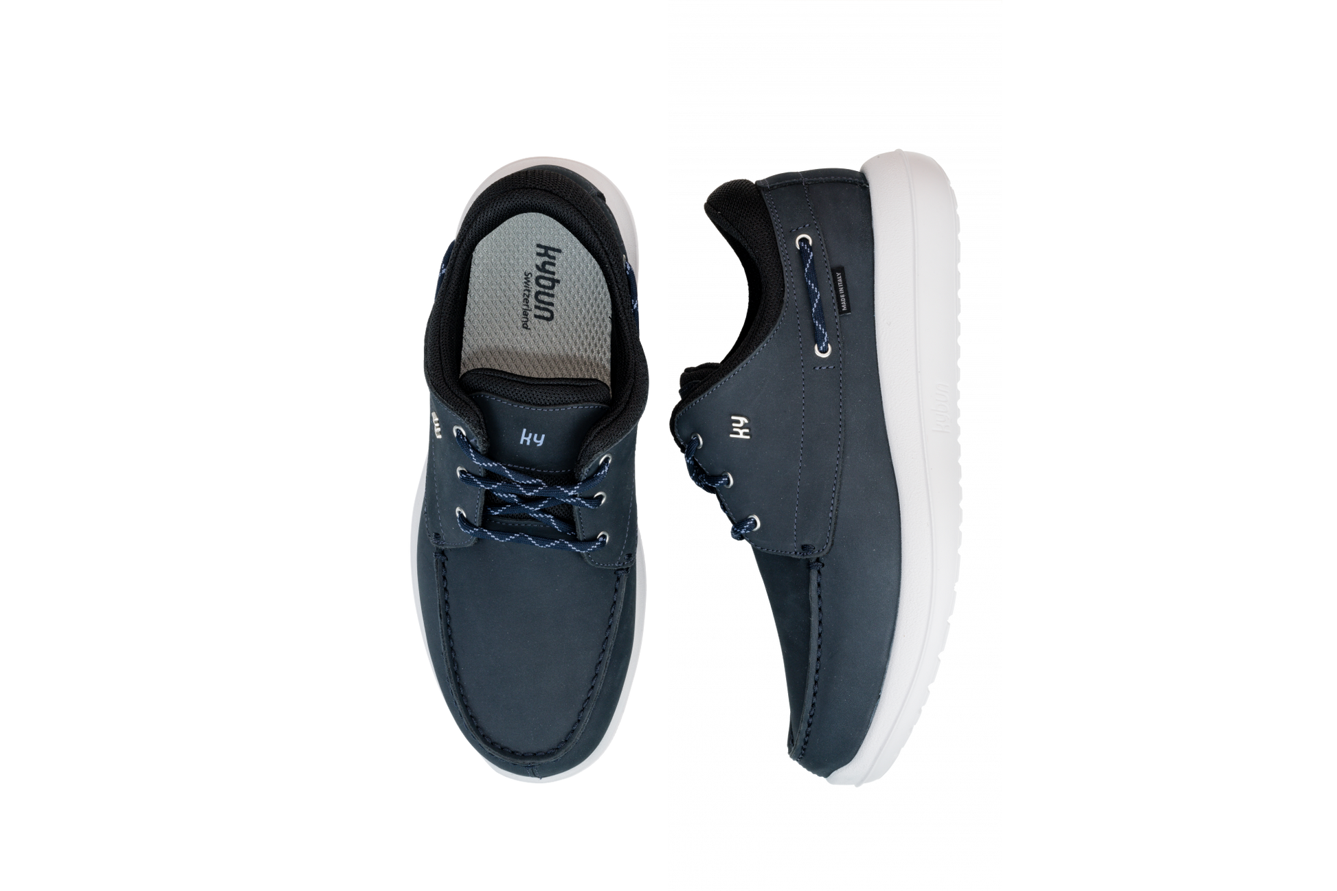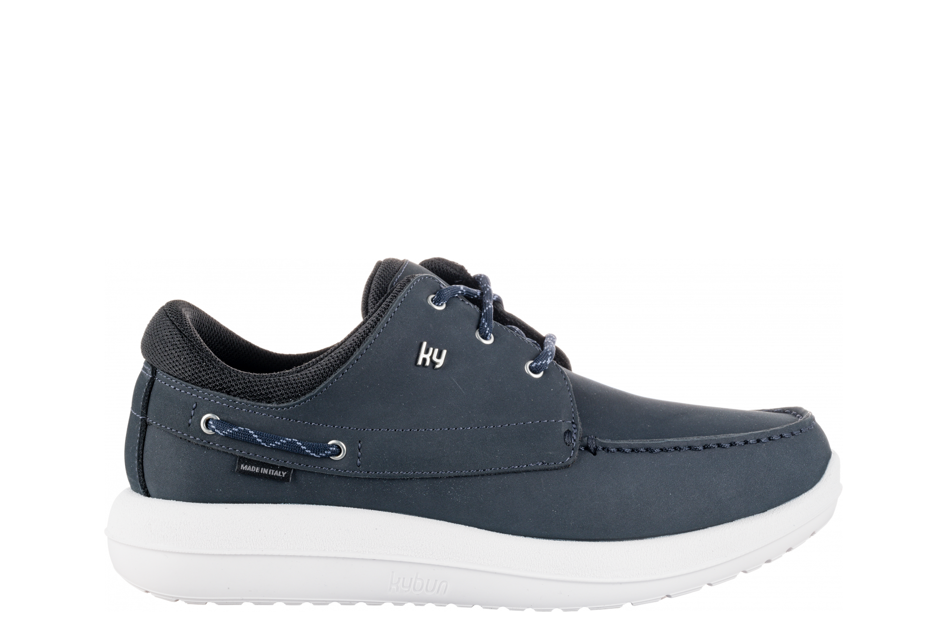 Casualness combined with the uniquely elastic springy feel of a kybun shoe. Always look your best in this moccasin-style shoe in the new Bulle Blue design with a dark blue upper part. A particular characteristic of this deck shoe is the two-tone laces with bright blue specks and the creative mock-laces on the side. The silver eyelets and the ky emblem emphasise the elegance of the Bulle Blue colour. The shoe can be worn equally well with jeans, chinos and summer shorts.