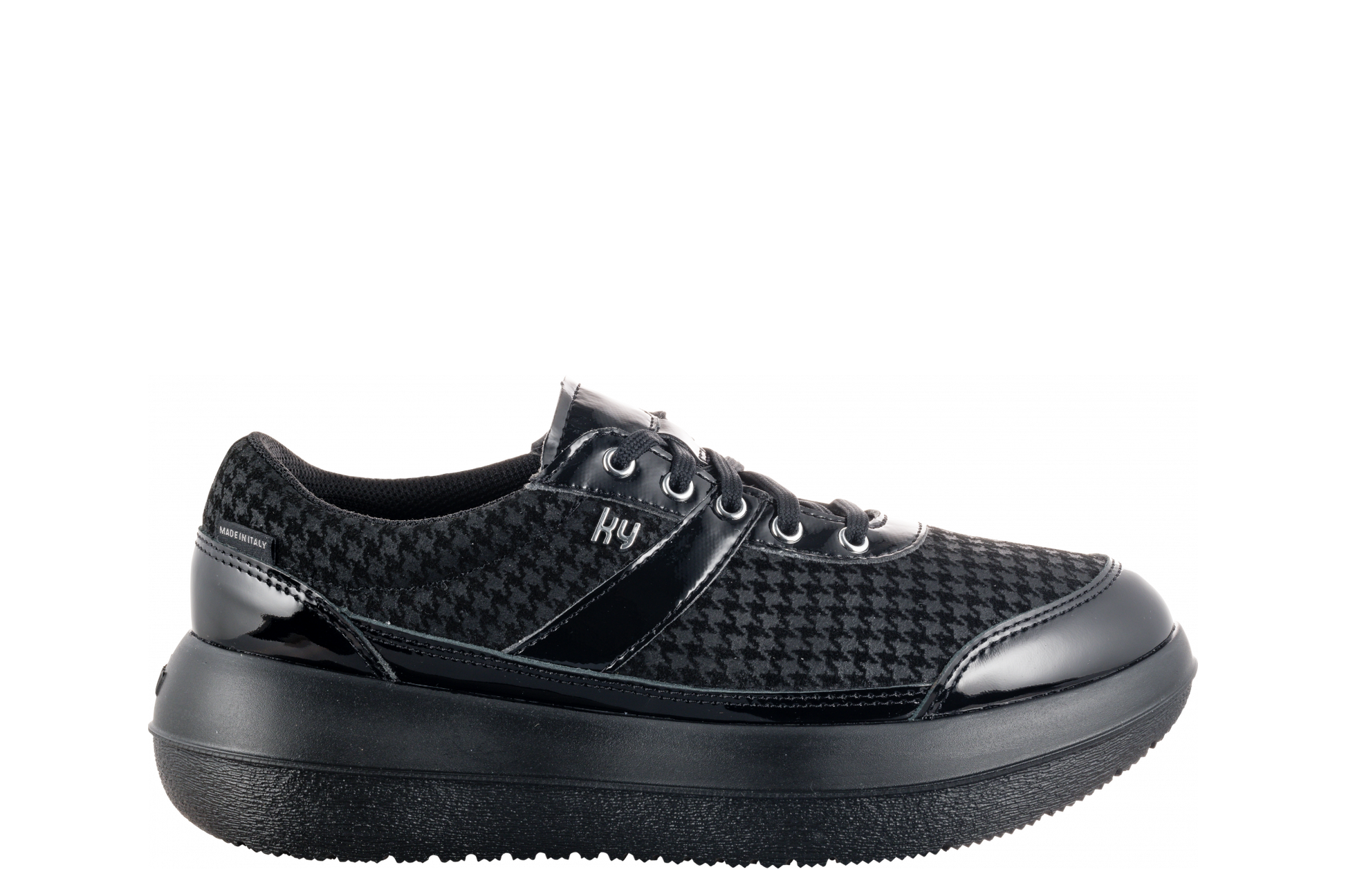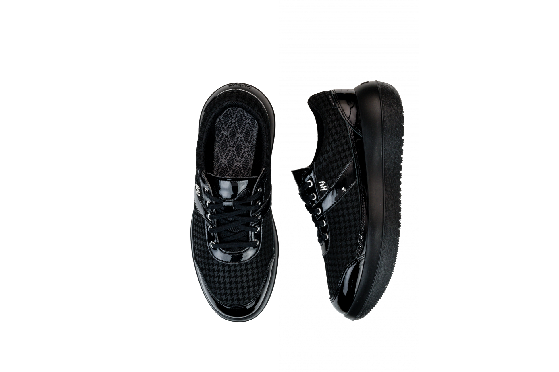 The fashionable houndstooth pattern combined with the patent leather makes the Aubonne Black Poule a very elegant shoe. Its fashionable look means it can be perfectly combined with various styles of clothing. A fashion-conscious companion for everyday life.